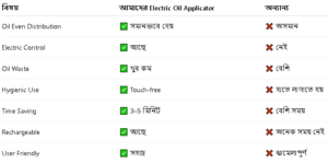 Electric Oil Applicator হলো একটি battery powered smart oiling device, যা তেল evenly scalp–এ পৌঁছে দেয় —